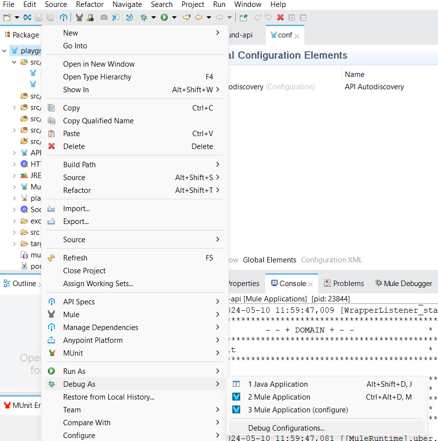 Right click your mule project and go to “Debug As” -> “Debug Configurations”